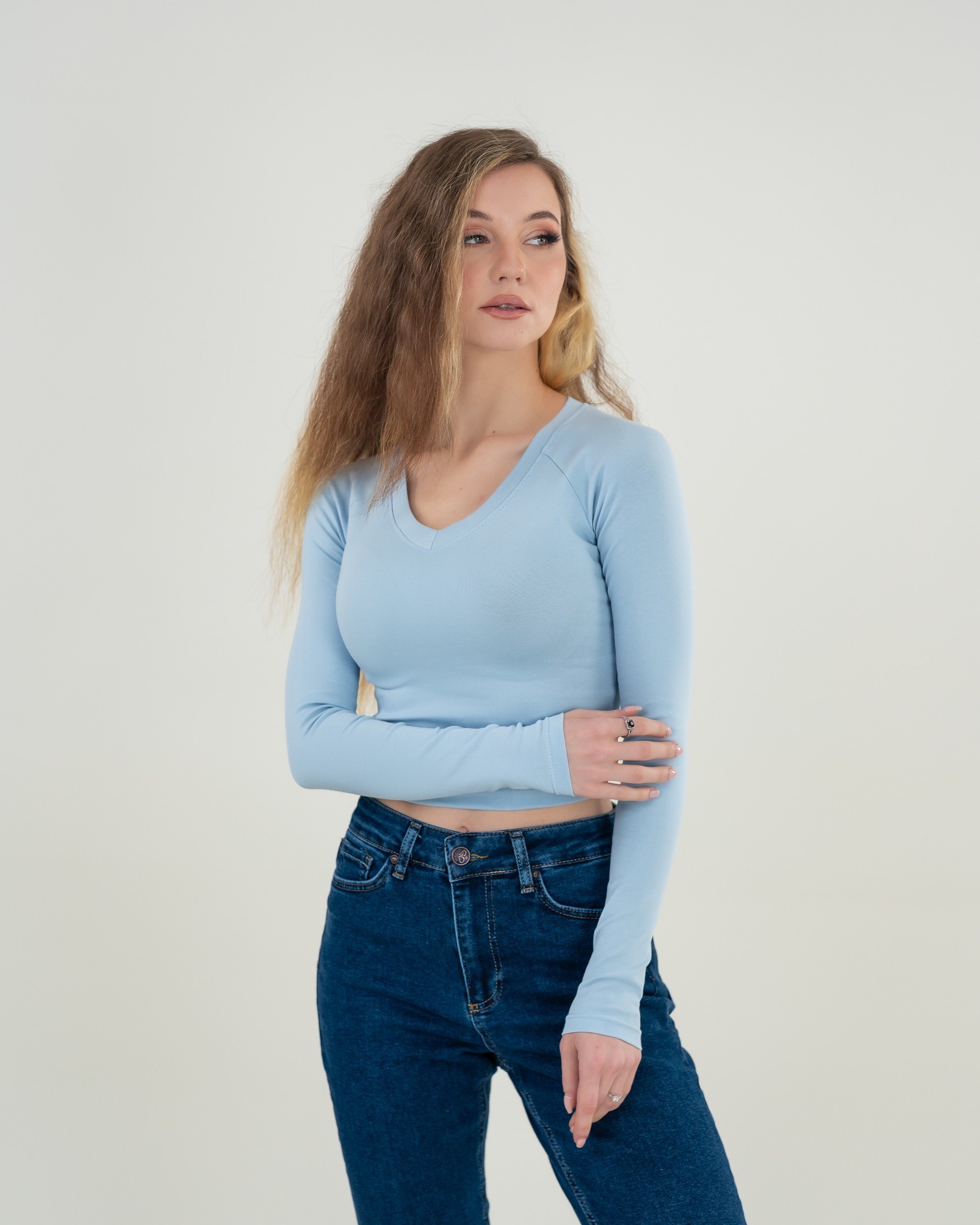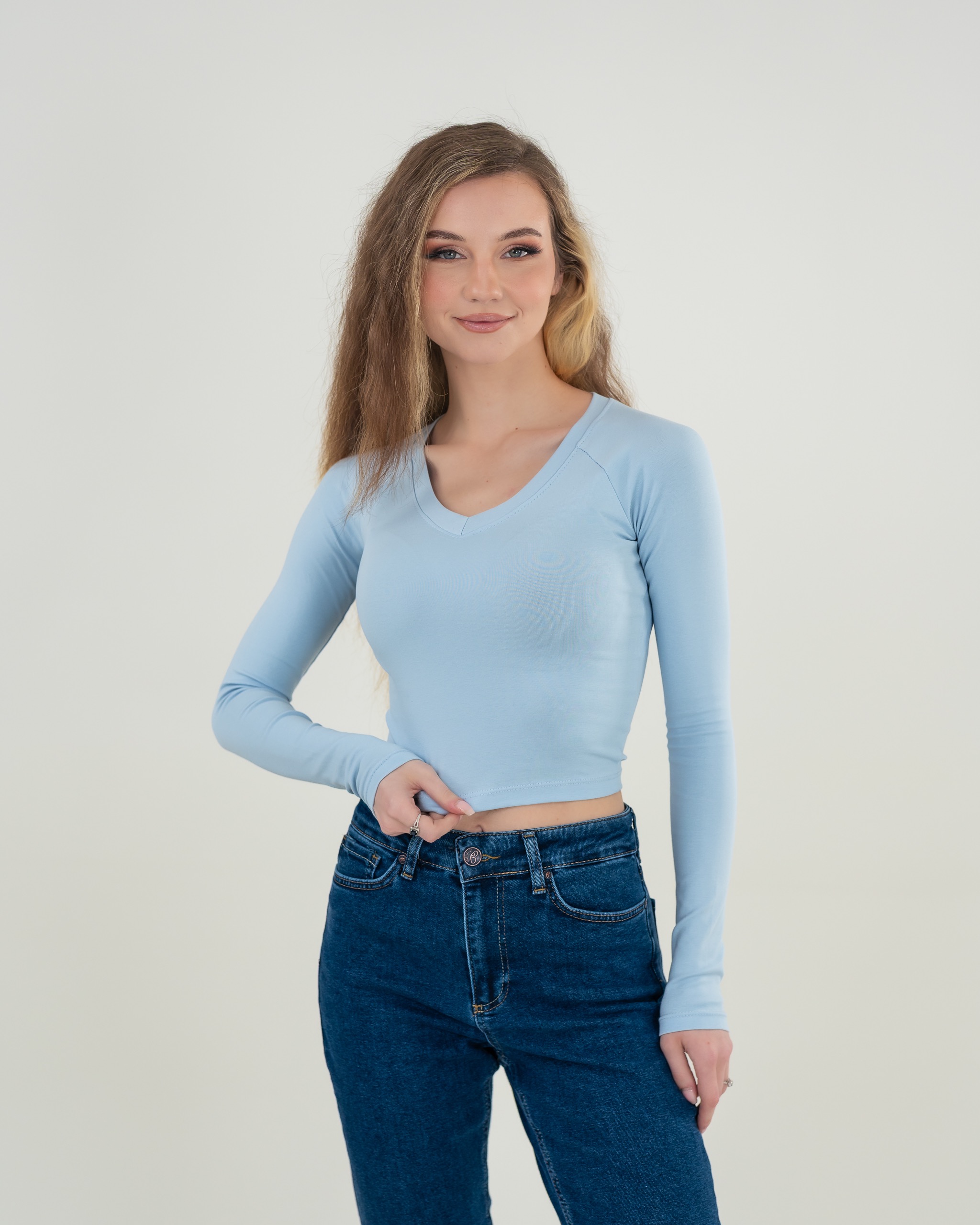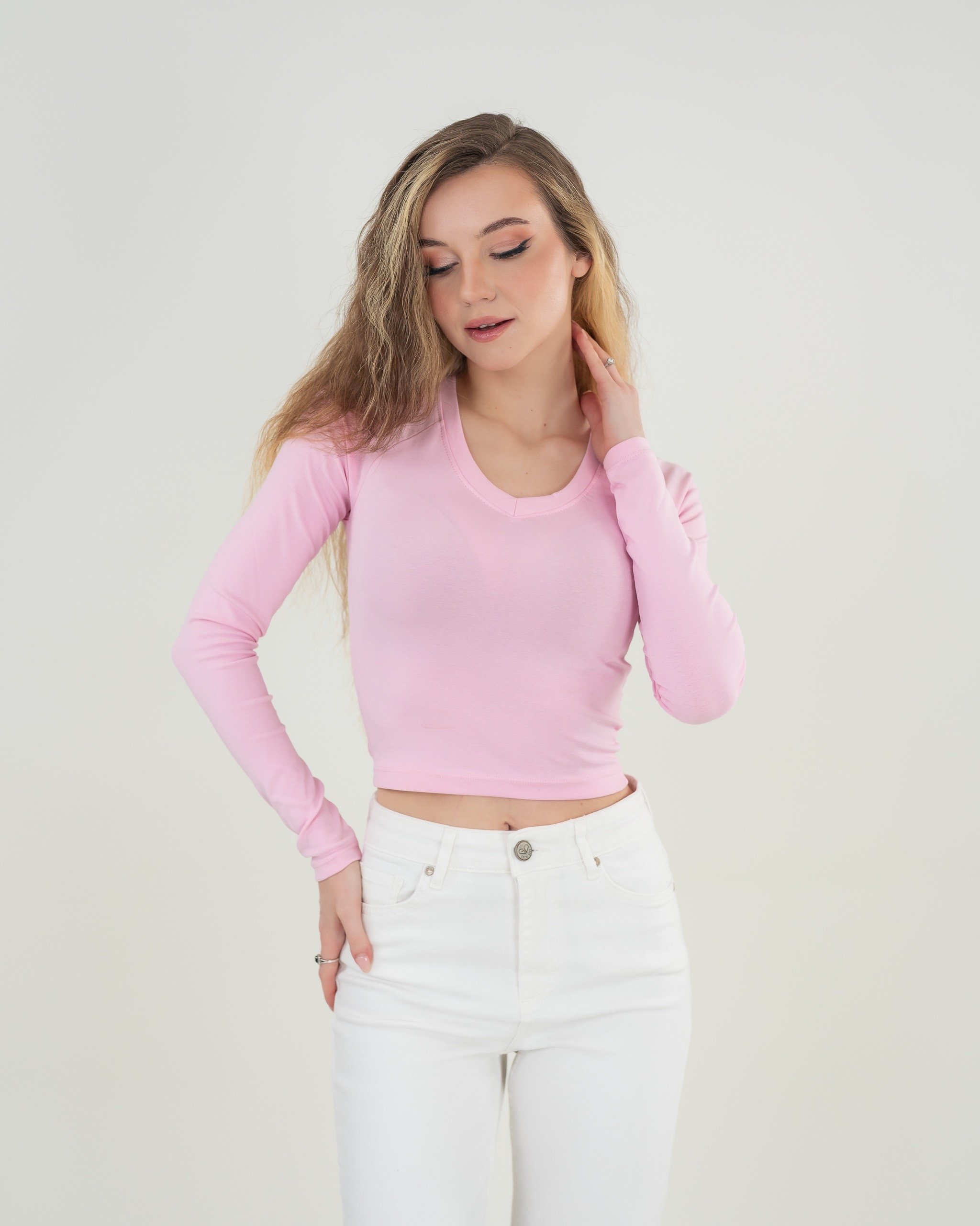 تألقي بإطلالة كاجوال ناعمة وعصرية مع هذه البلوزة القطن القصيرة المصممة بياقة على شكل حرف V وأكمام طويلة.