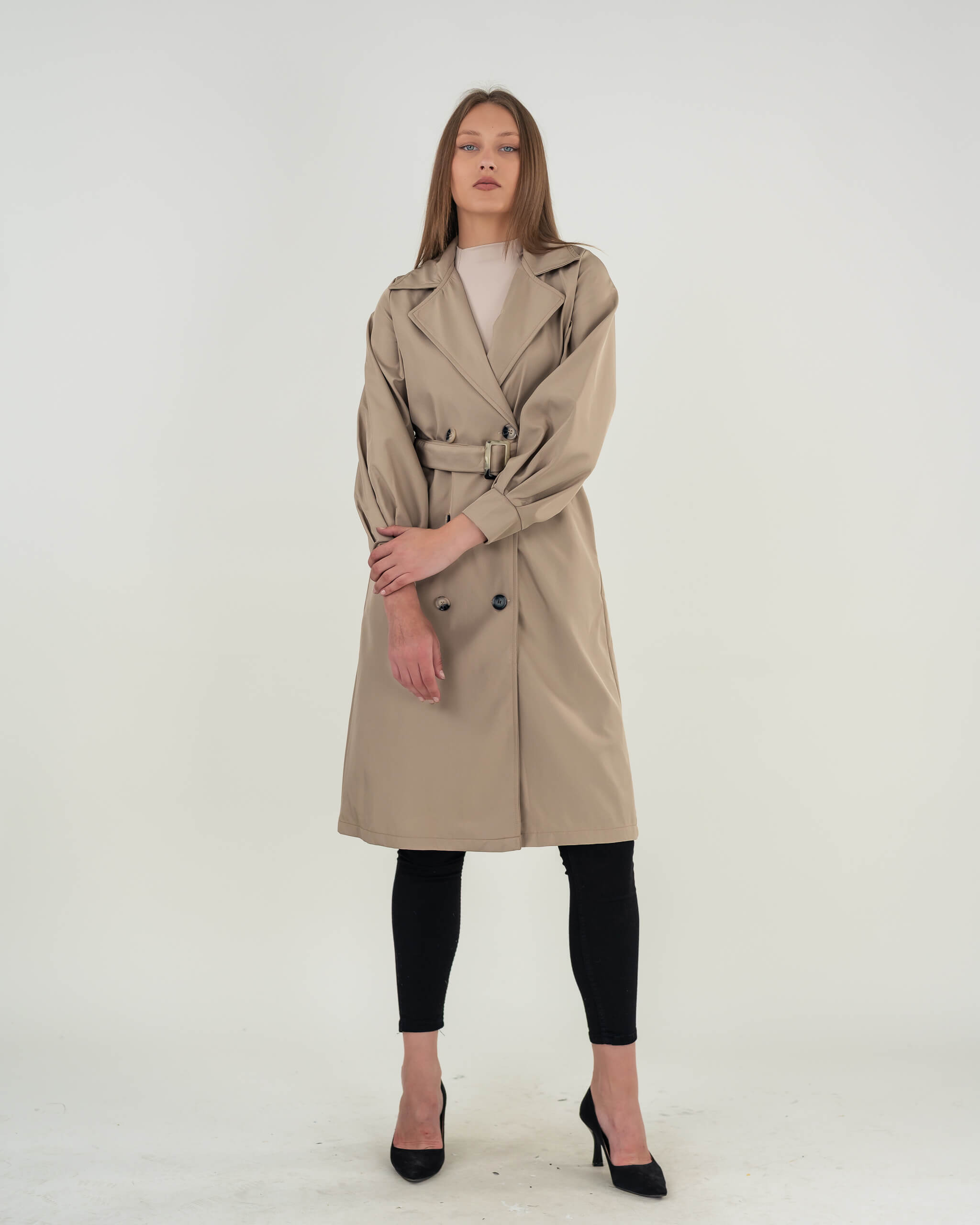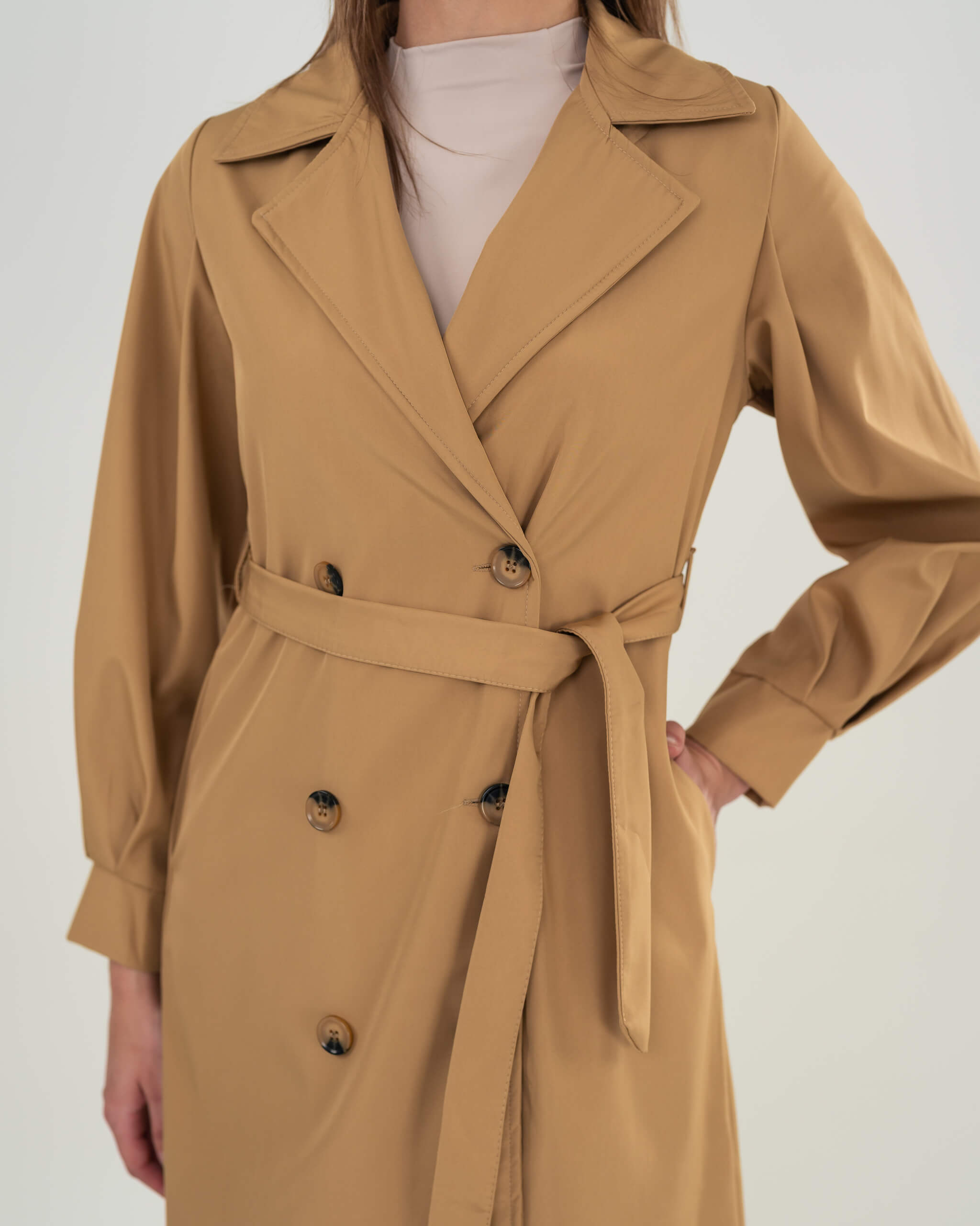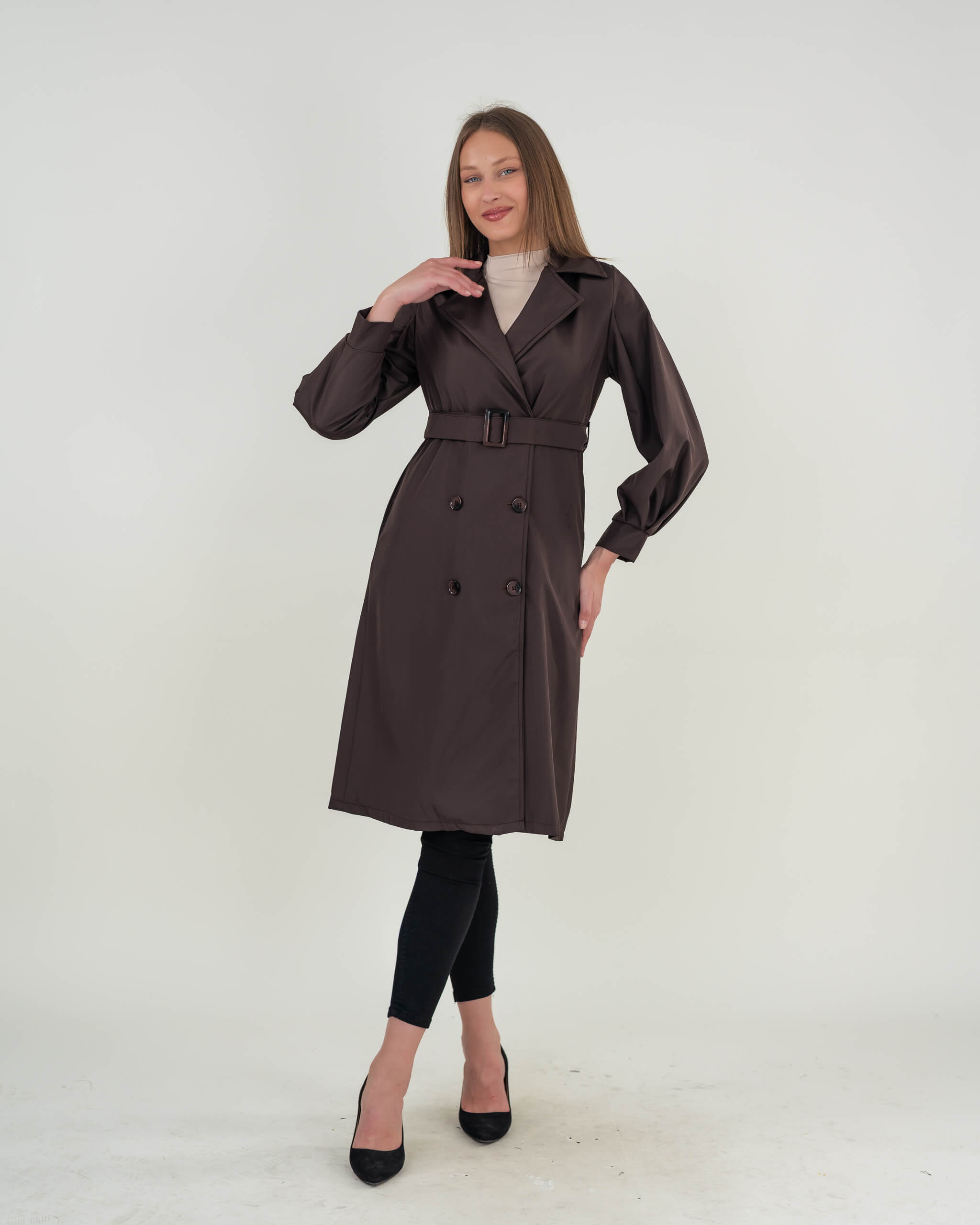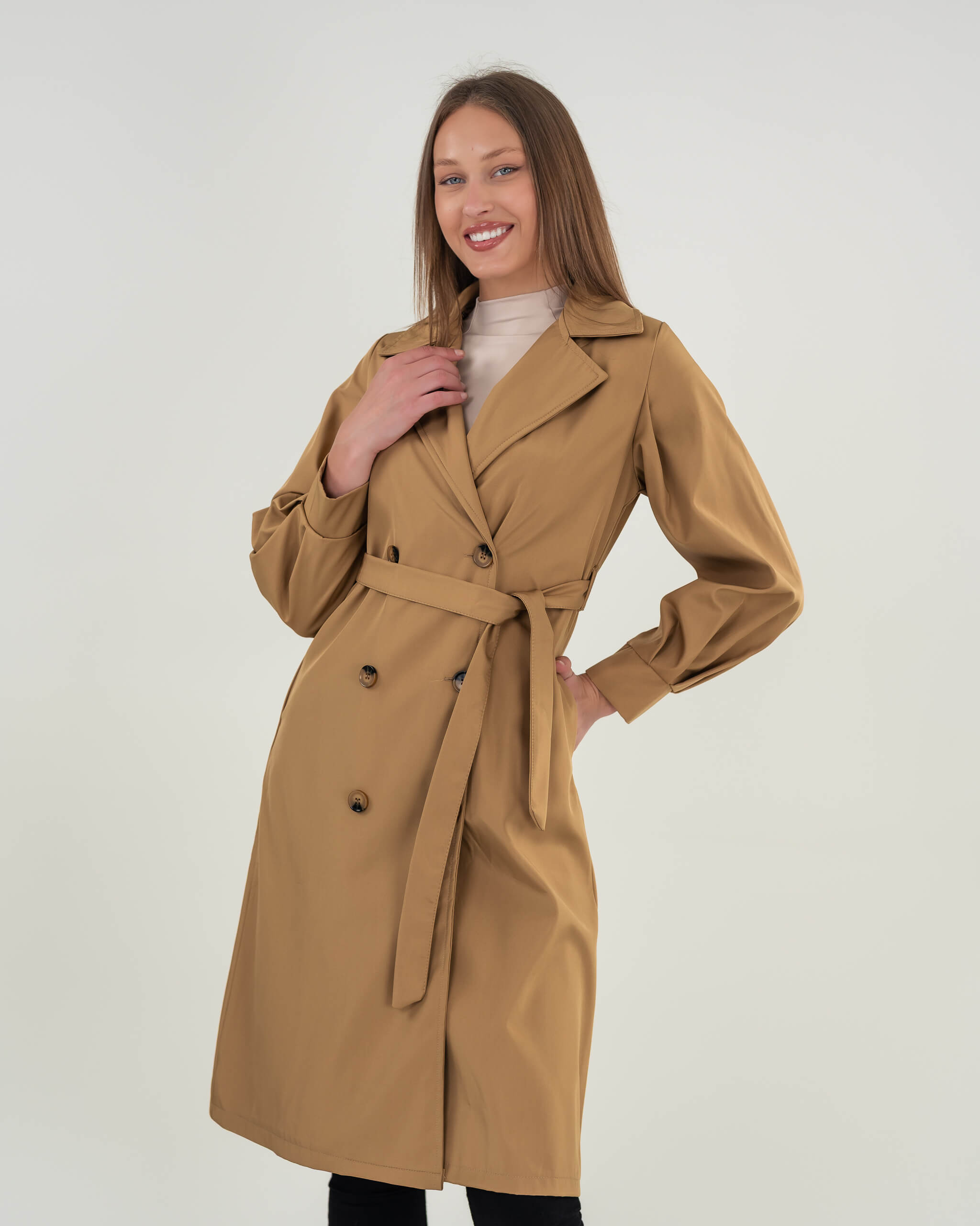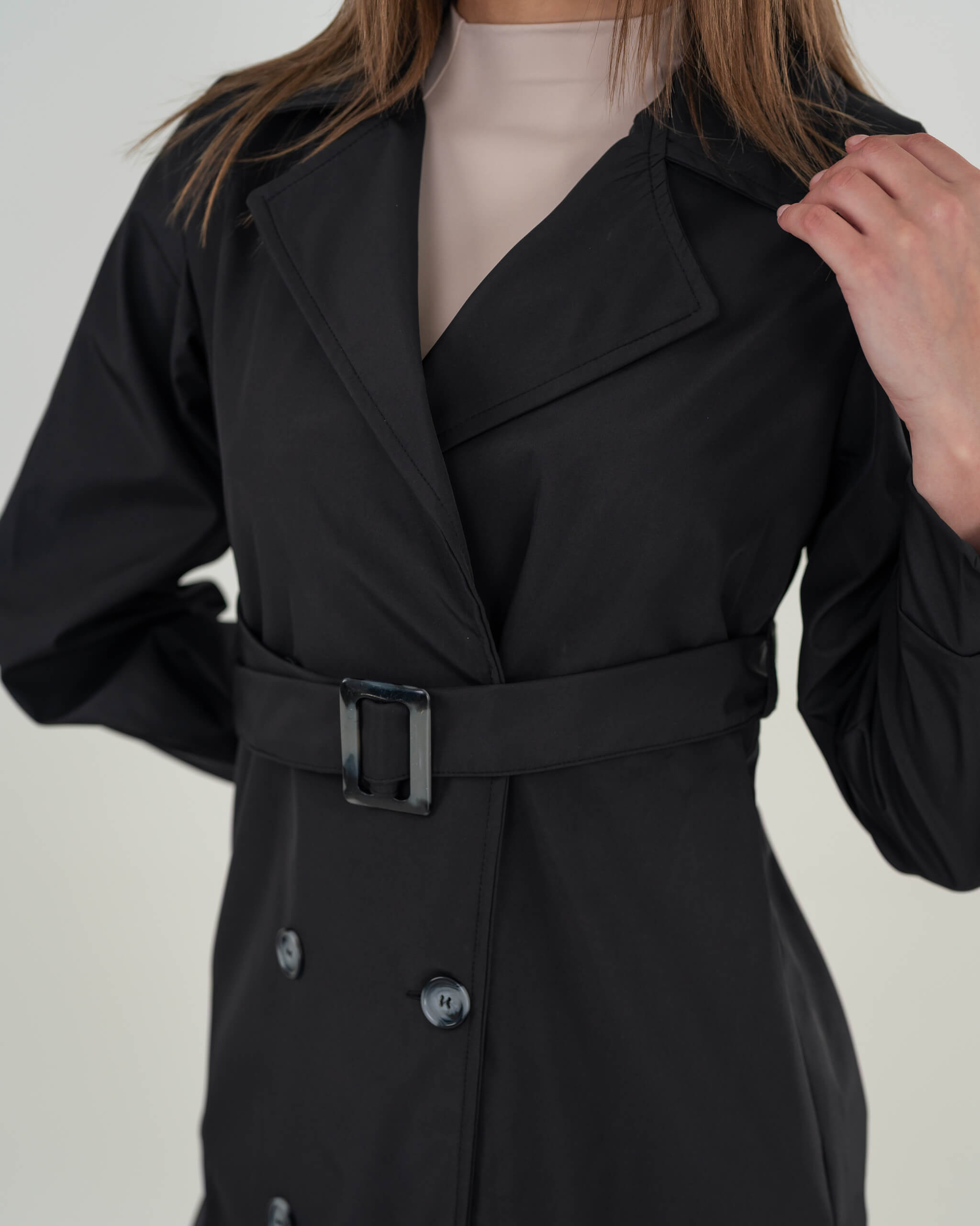 جاكيت نسائي طويل أنيق مقاوم للمطر، يتميز بتصميم كلاسيكي راقٍ مع أزرار أمامية وحزام يحدد الخصر ليمنحك مظهرًا أنثويًا جذابًا.