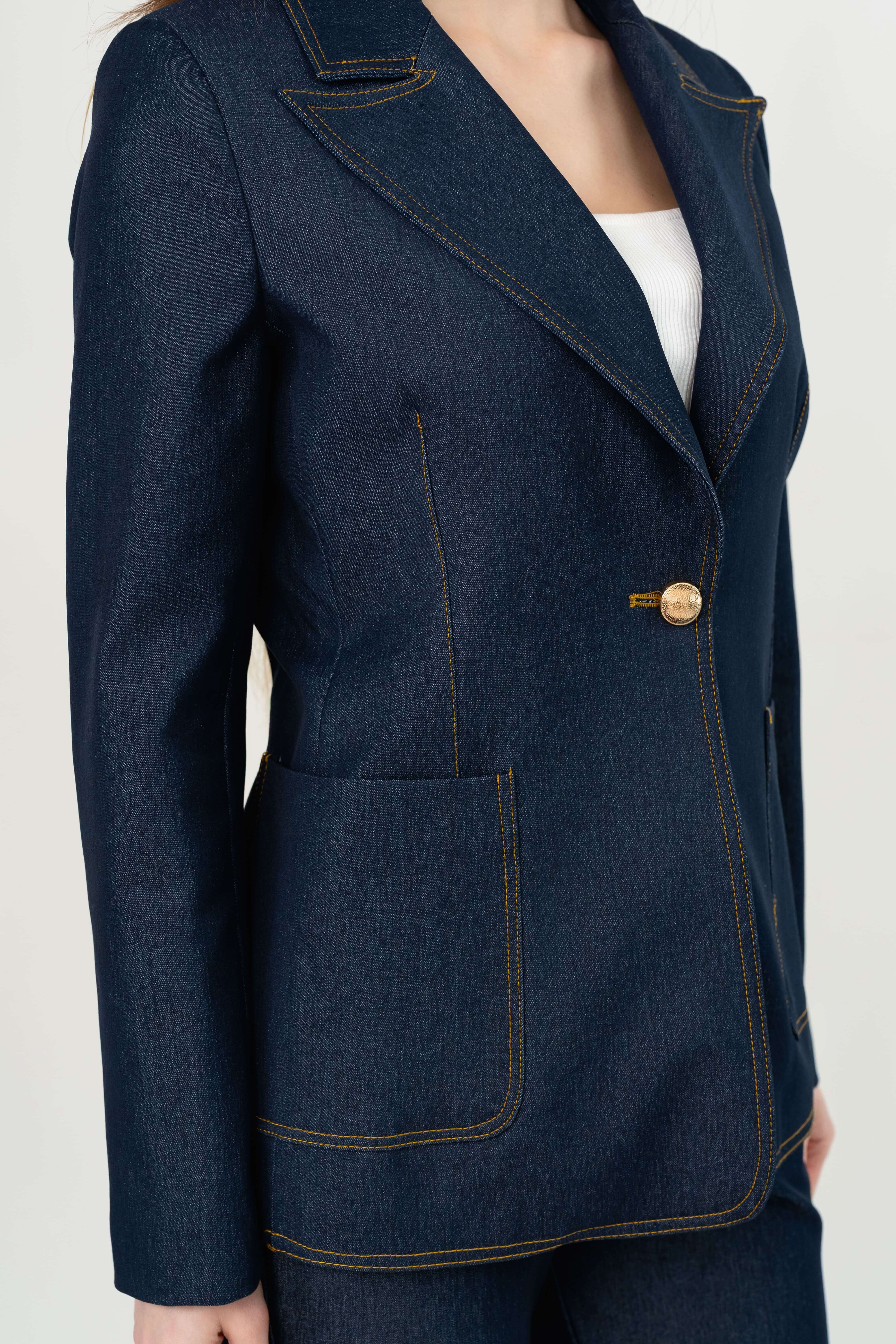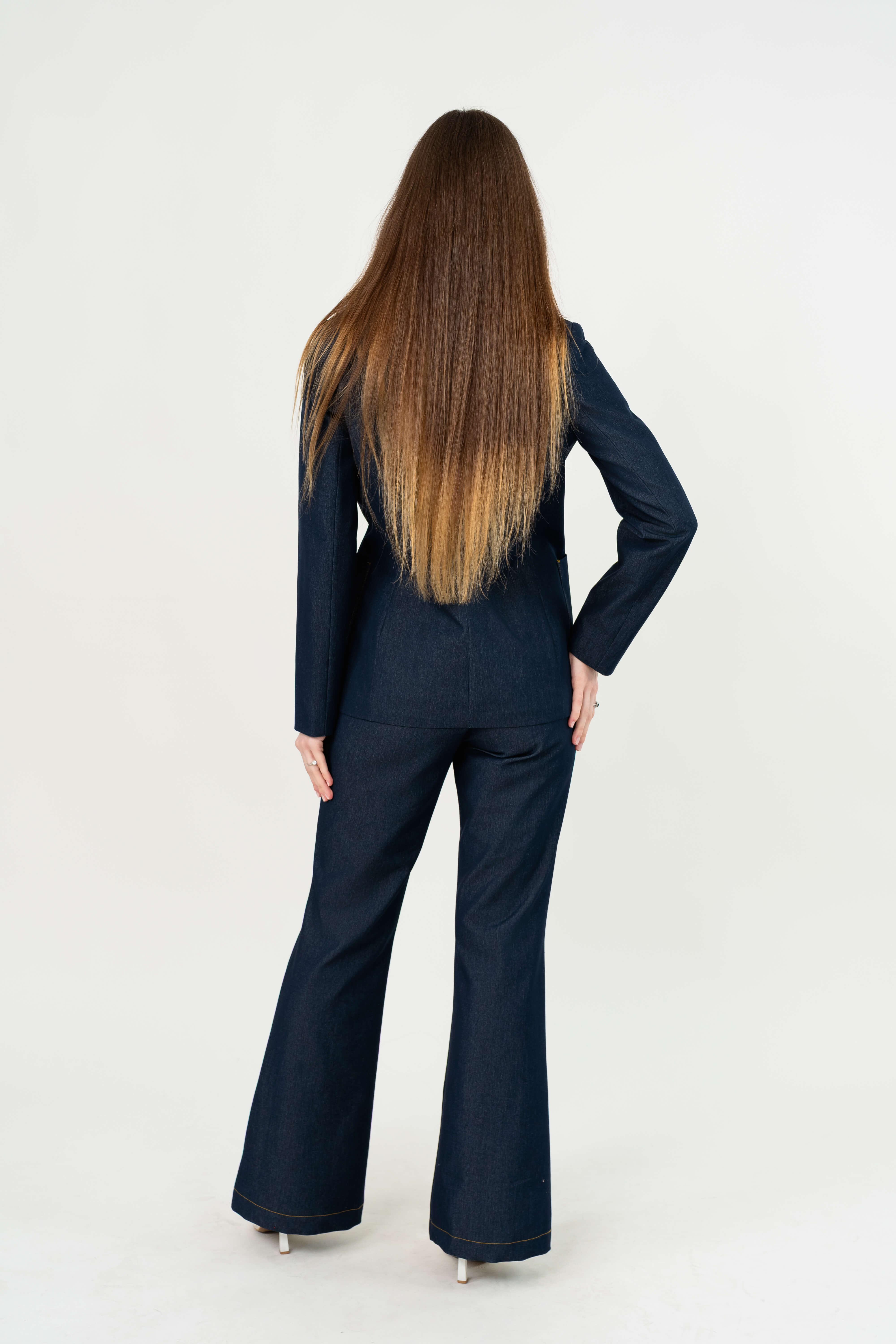 طقم جينز رسمي فخم مصمّم بقصة مخصّرة تضيف لمسة أنوثة وأناقة على إطلالتك. مثالي لاجتماعات العمل،