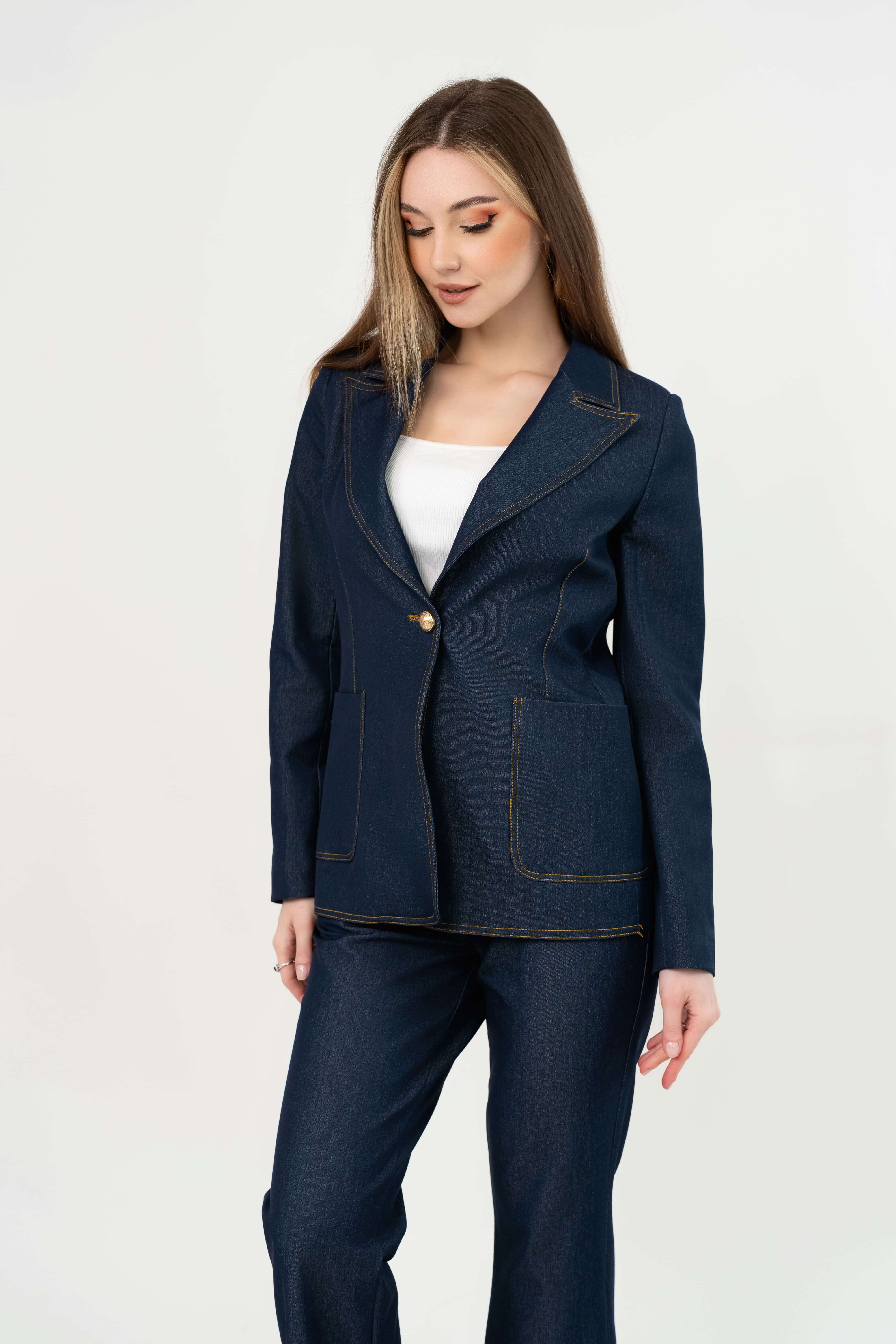 إذا كنتِ تبحثين عن طقم جينز رسمي بلمسة فاخرة ولون أنيق، الطقم الكحلي دا هو خيارك الأمثل: