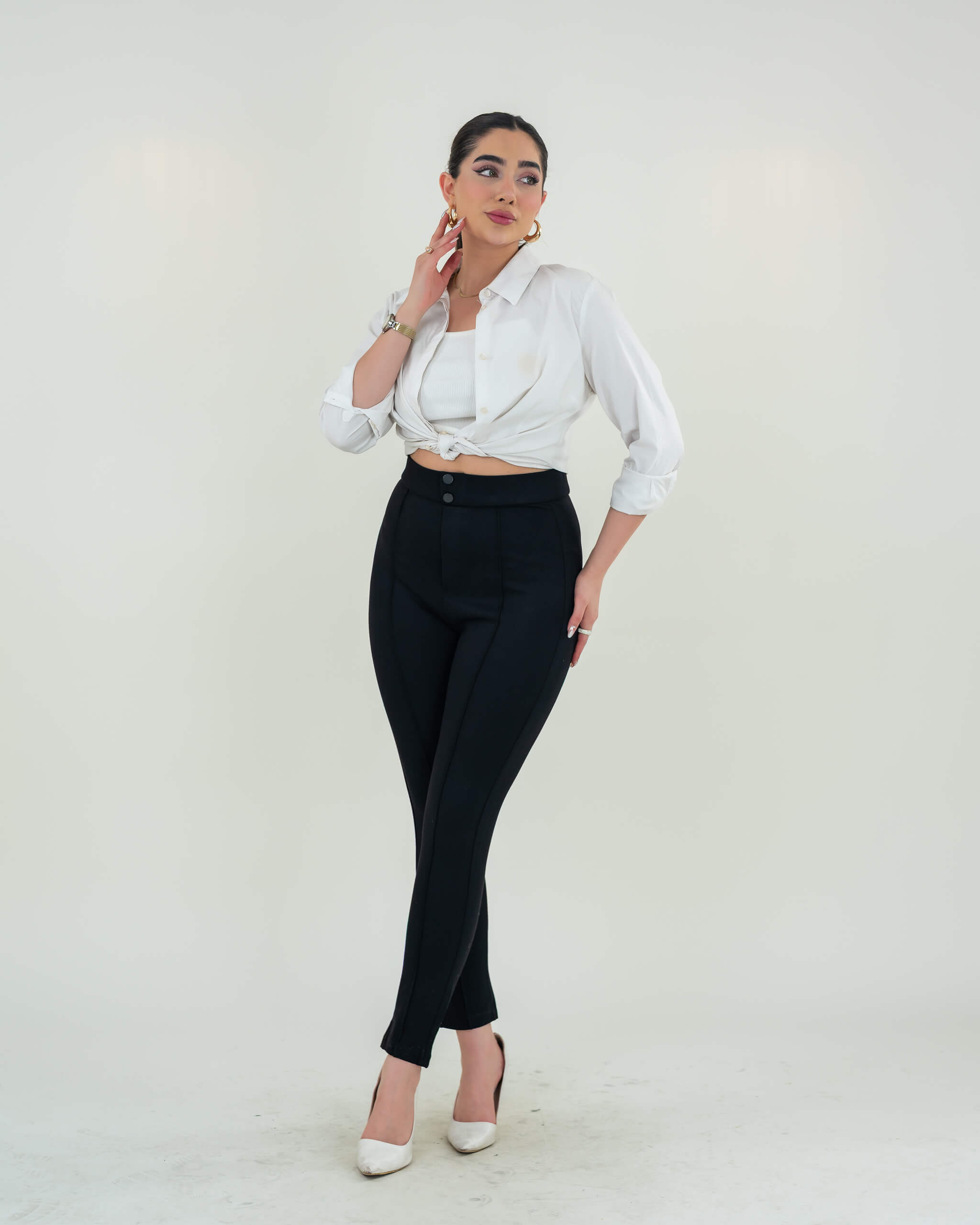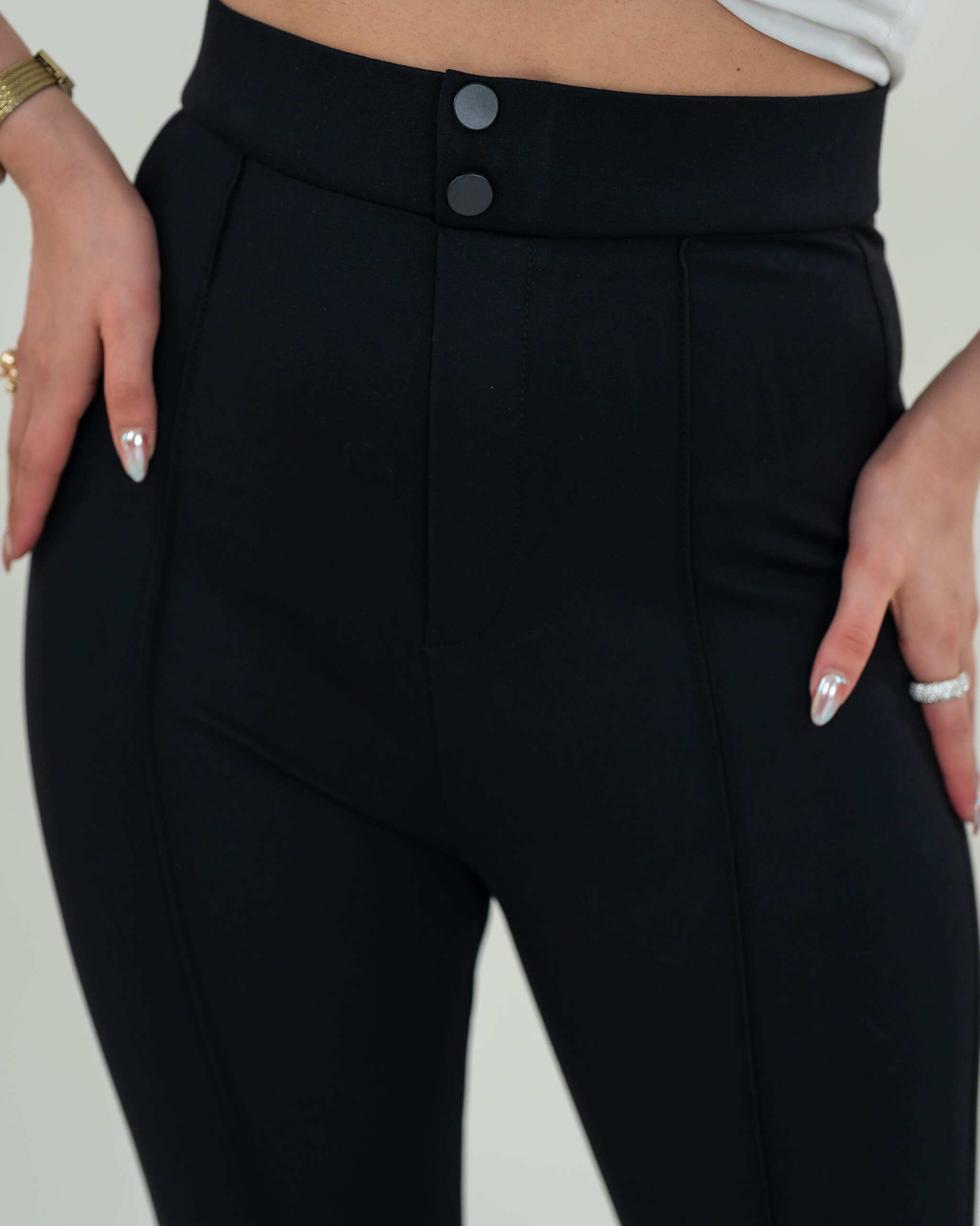 بنطلون قماش يتميز بأزرار على الخصر تضيف لمسة مميزة وعملية، مع قصة سكيني تناسب القوام وتبرز الأناقة.