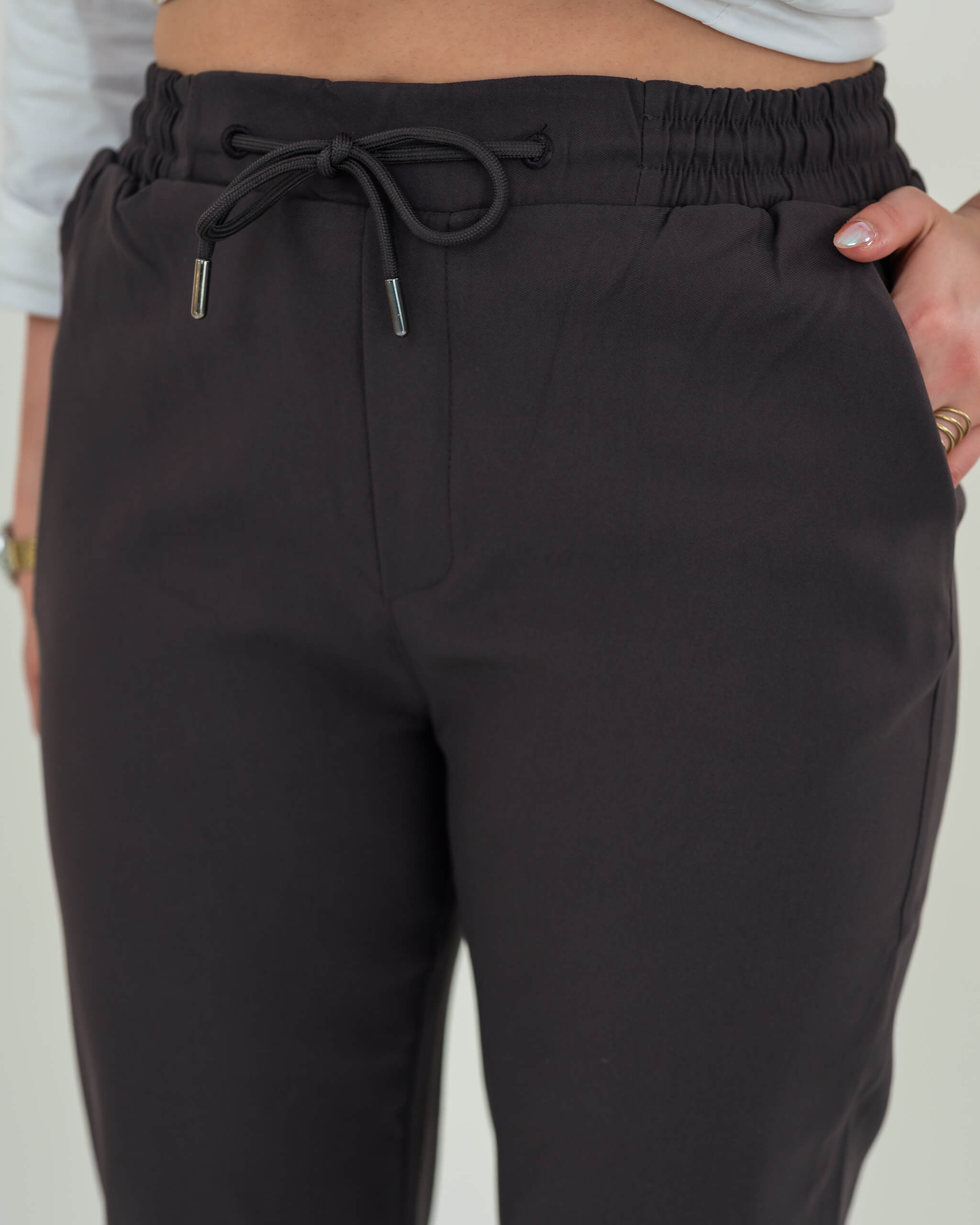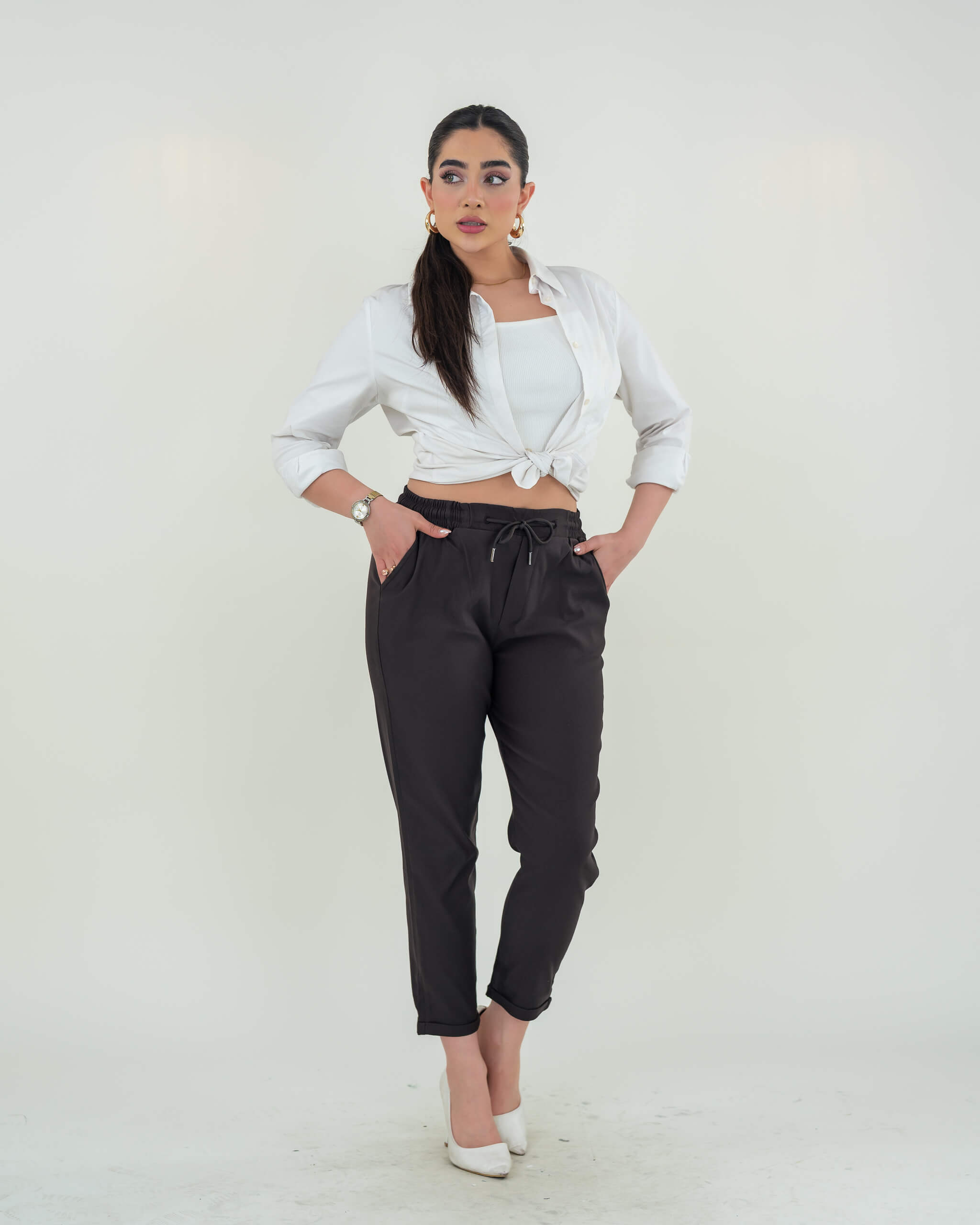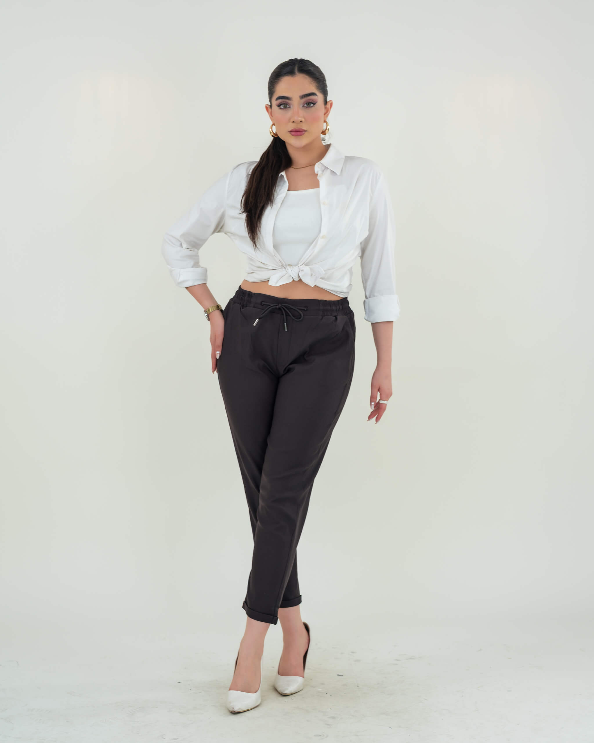 بنطلون نسائي يتميز بلونه البني الكلاسيكي، و خصر مطاطي مع رباط لمرونة أكبر، بالإضافة إلى تصميم مثني من الأسفل يضيف لمسة شبابية أنيقة.