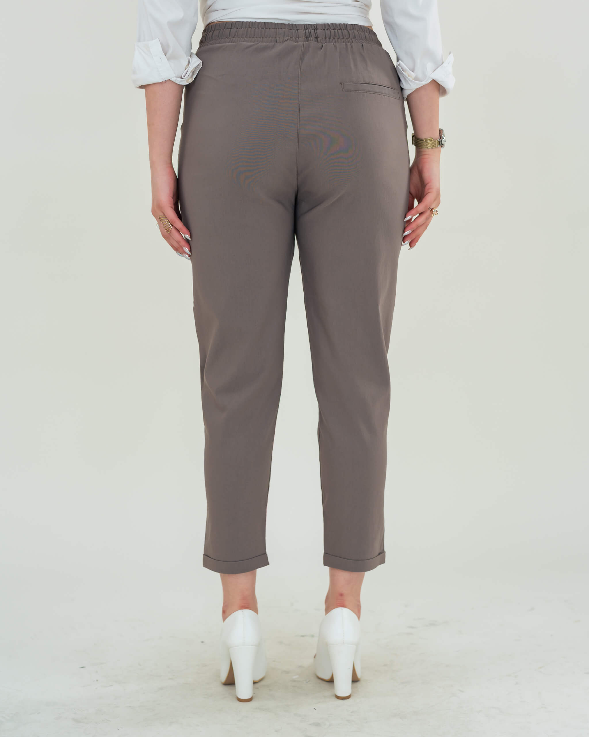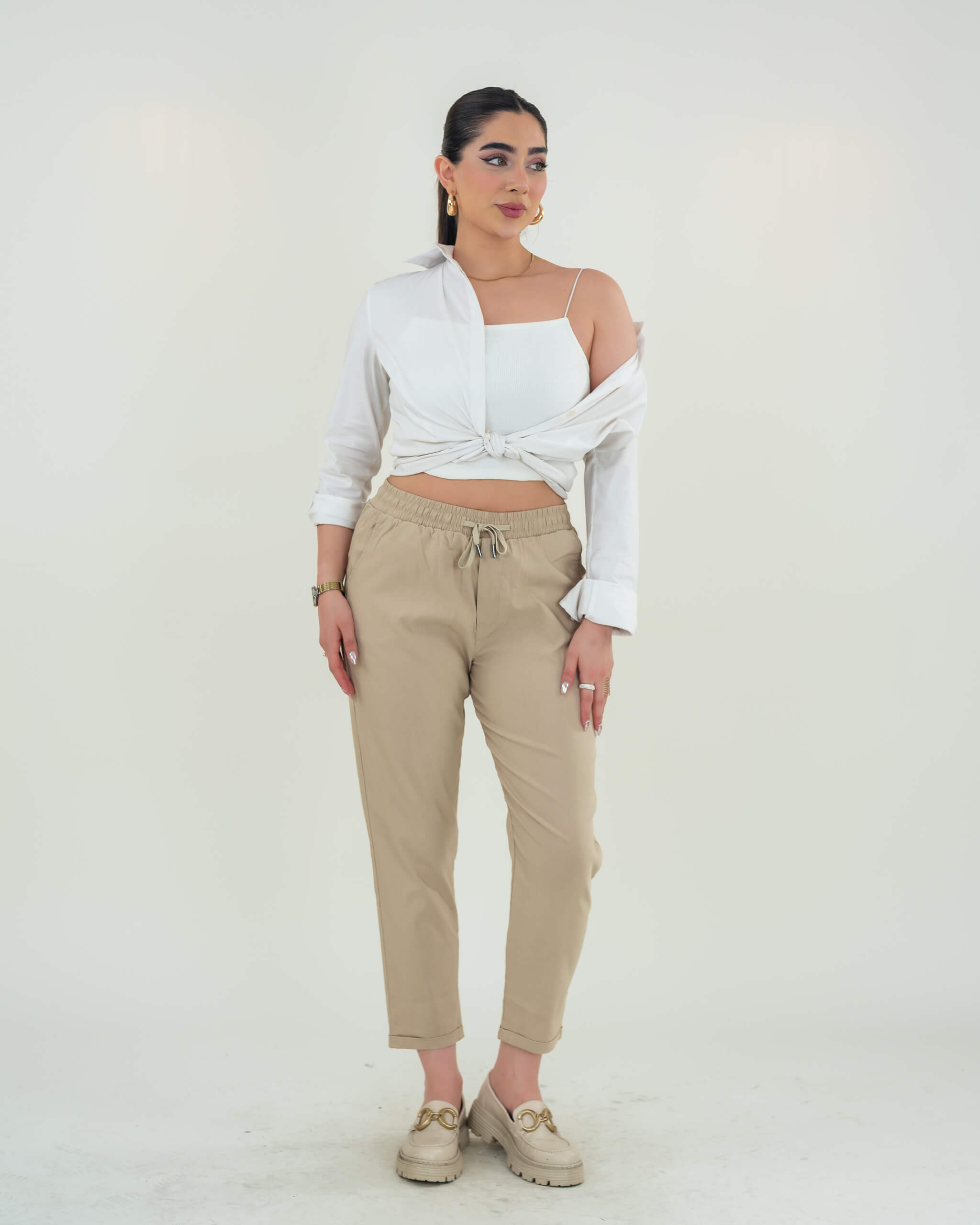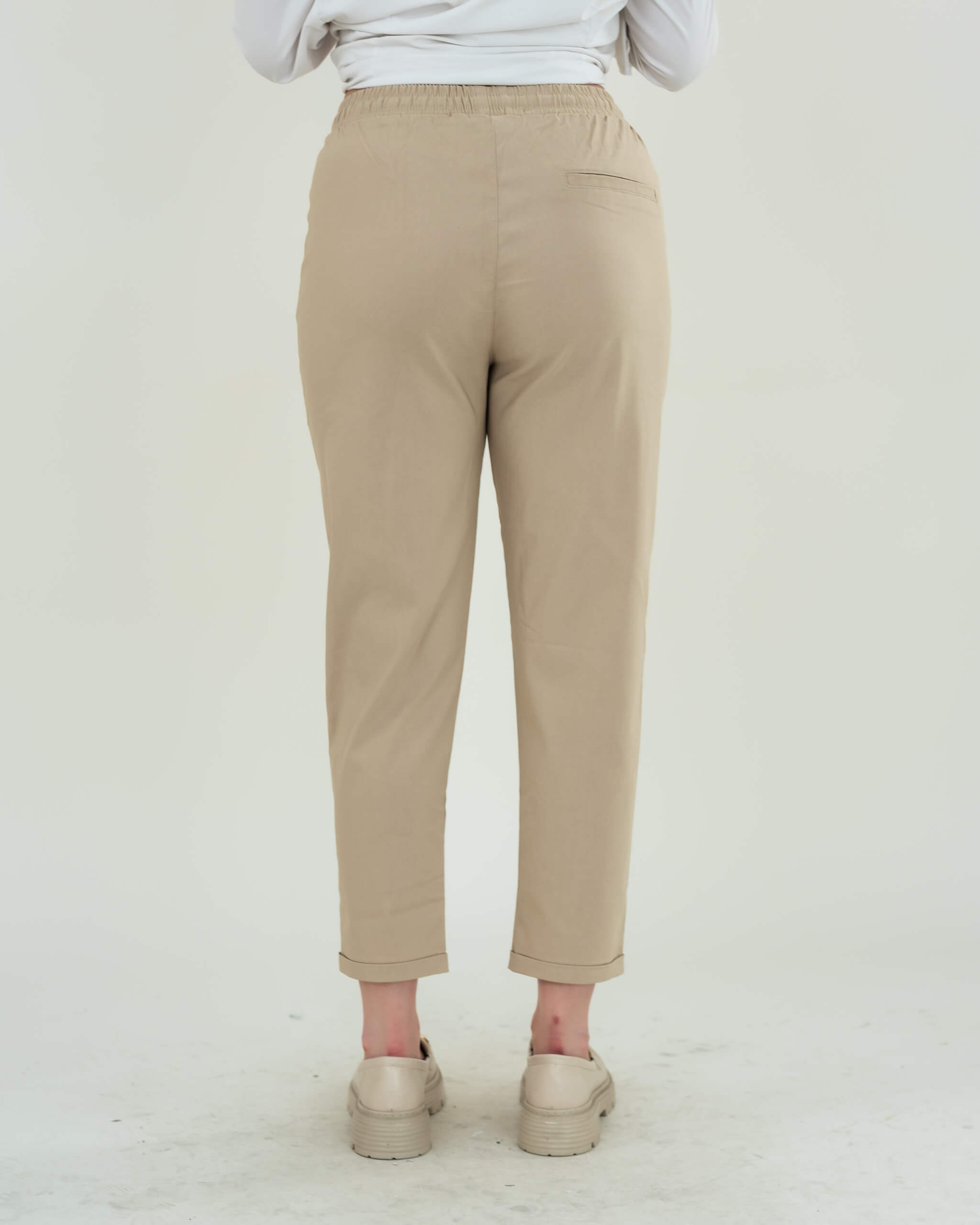 بنطلون قماش برباط مزود بخصر مطاطي لراحة إضافية، وتصميم مثني من الأسفل ليمنحك لمسة شبابية أنيقة.