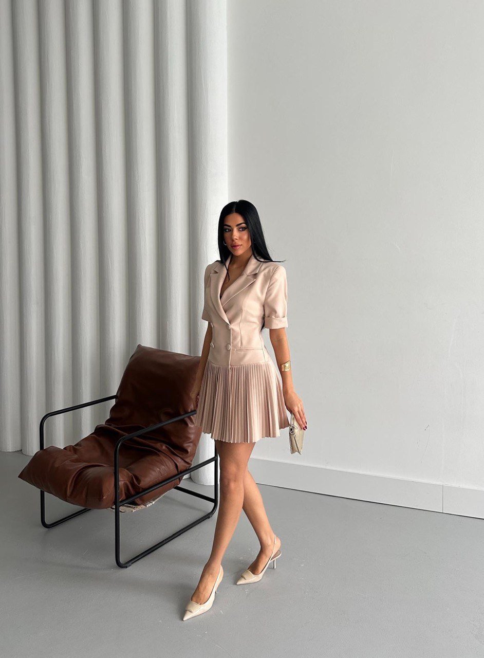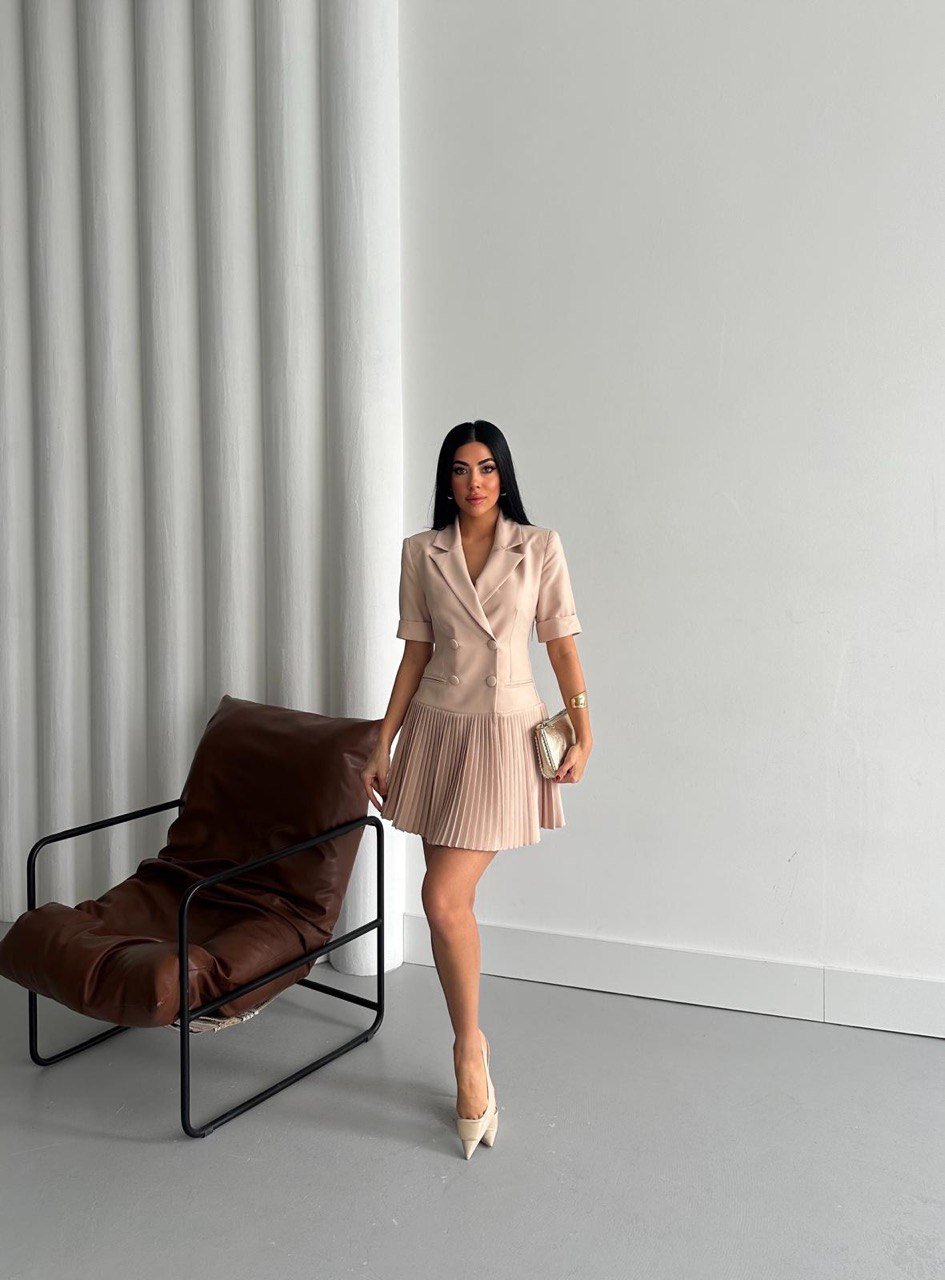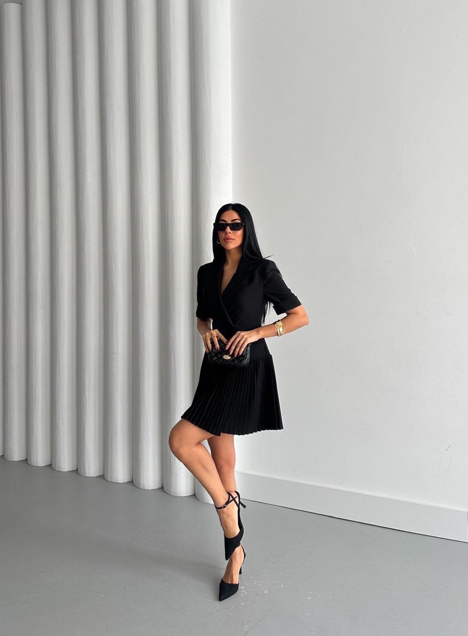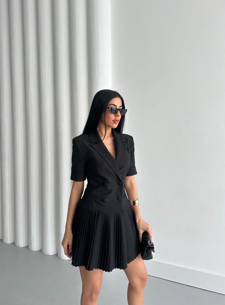التصميم: فستان قصير بكسرات ناعمة من الخصر، قصّة مريحة وانسيابية تبرز القوام بشكل جذاب ومناسب لكل الأوقات.