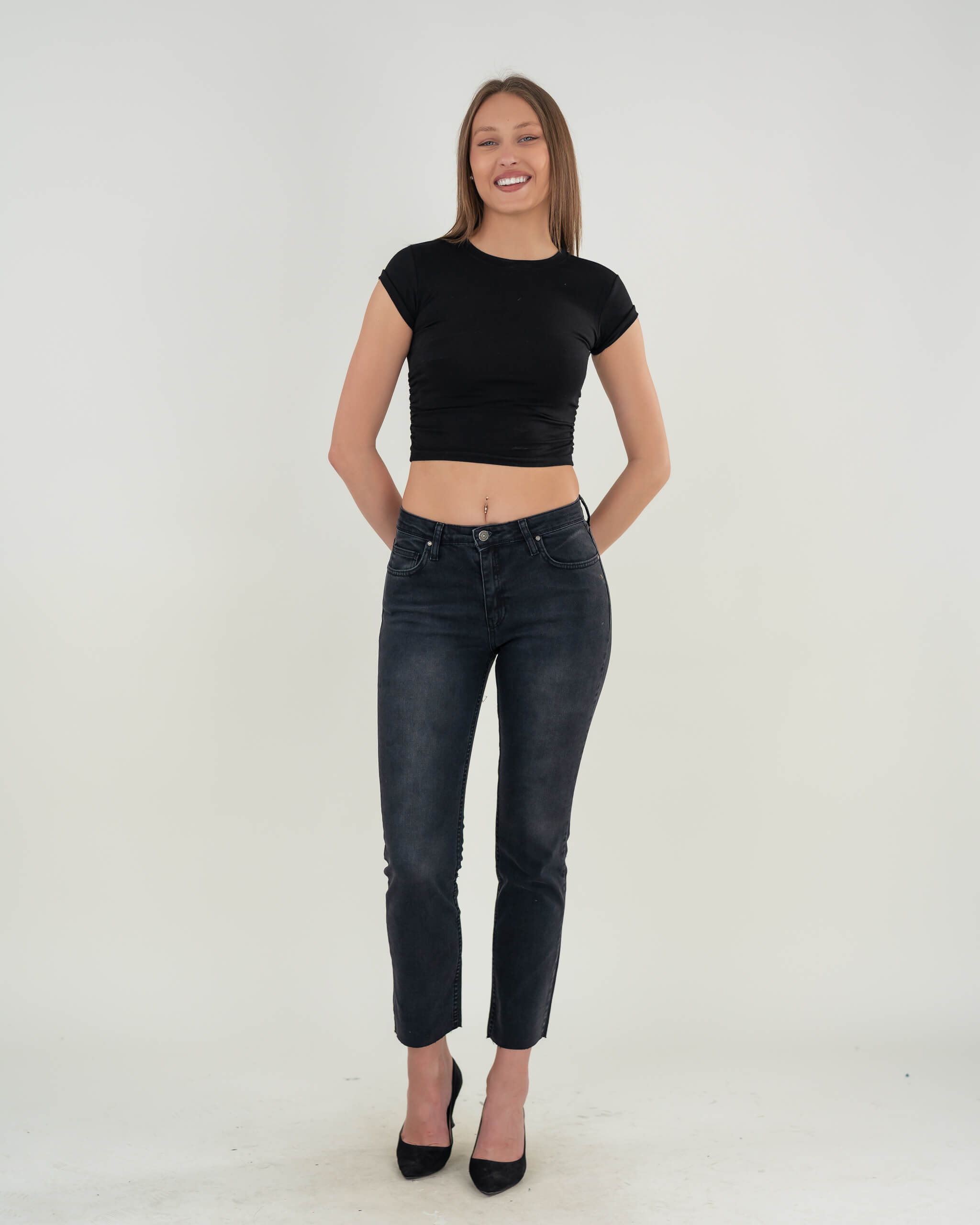 التصميم: جينز بقصة سكيني - يتميز بمسحة اماميه لاطلالة مميزة - أطراف مهدبة