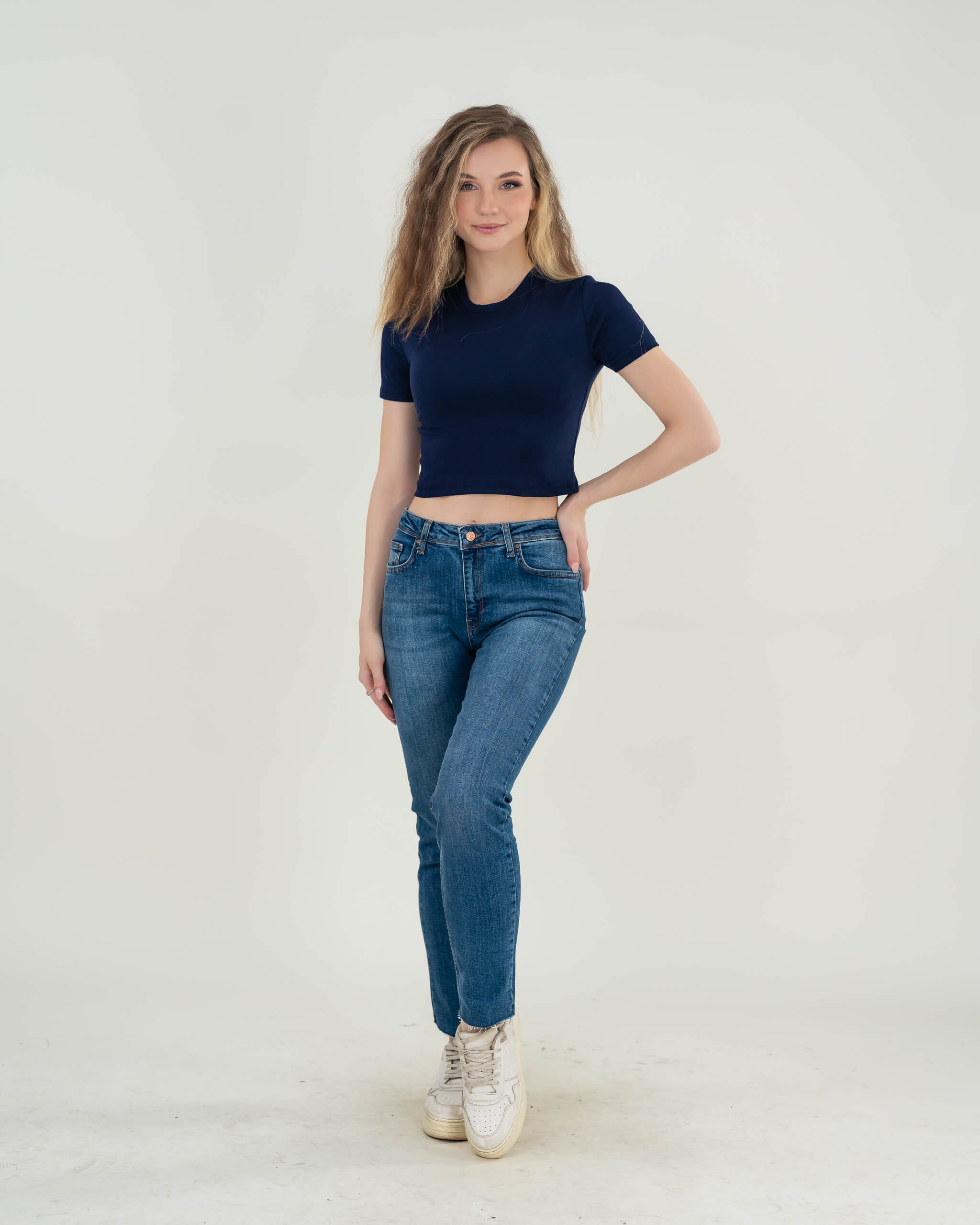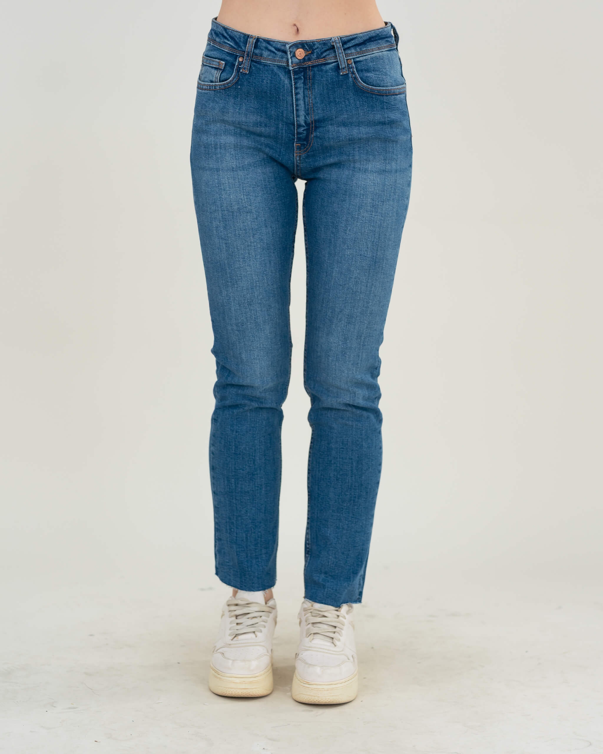 جينز نسائي سكيني أنيق يجمع بين التصميم الكلاسيكي ولمسة عصرية جريئة. يتميز بمسحة خفيفة في مقدمة البنطلون واطراف مهدبة ،