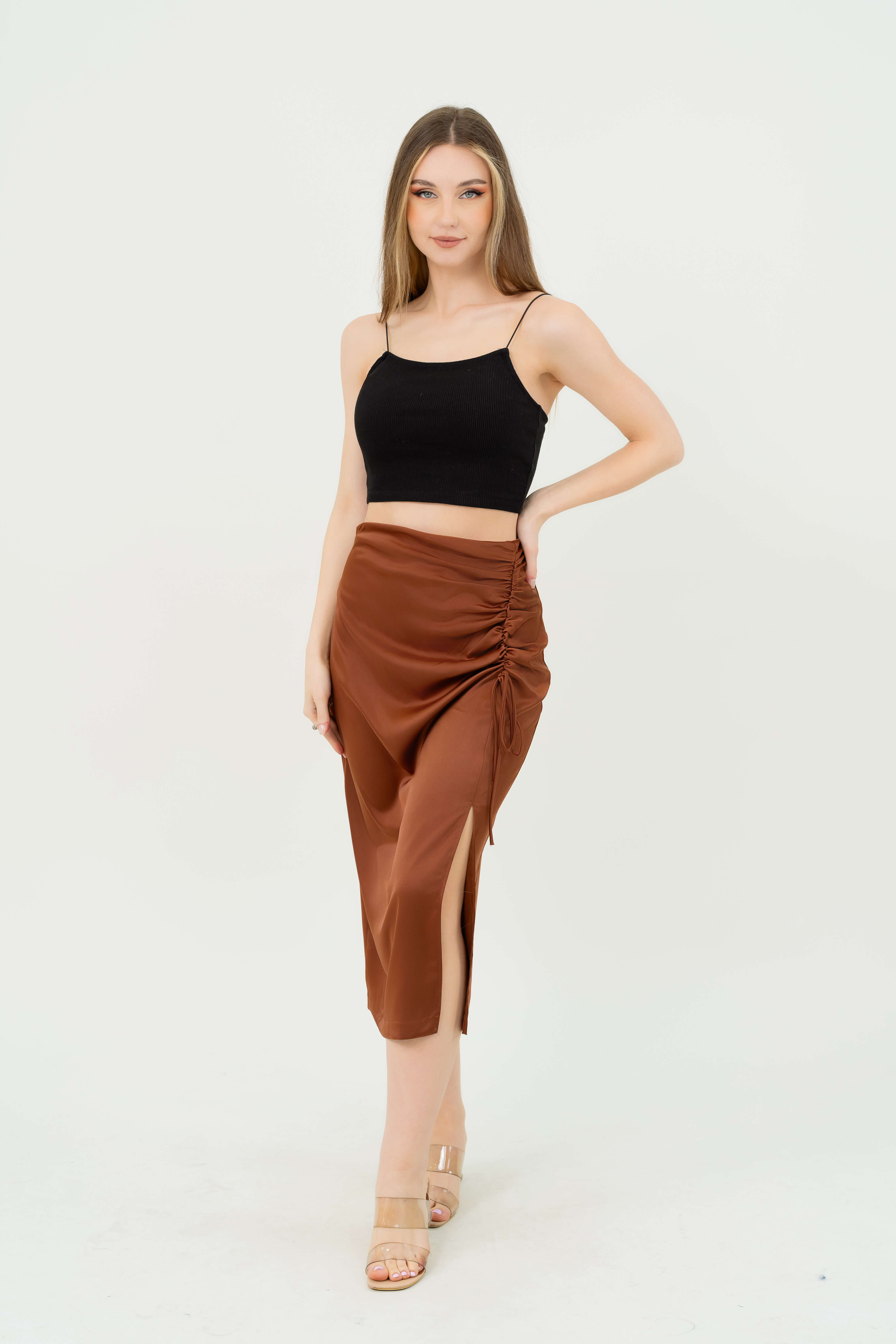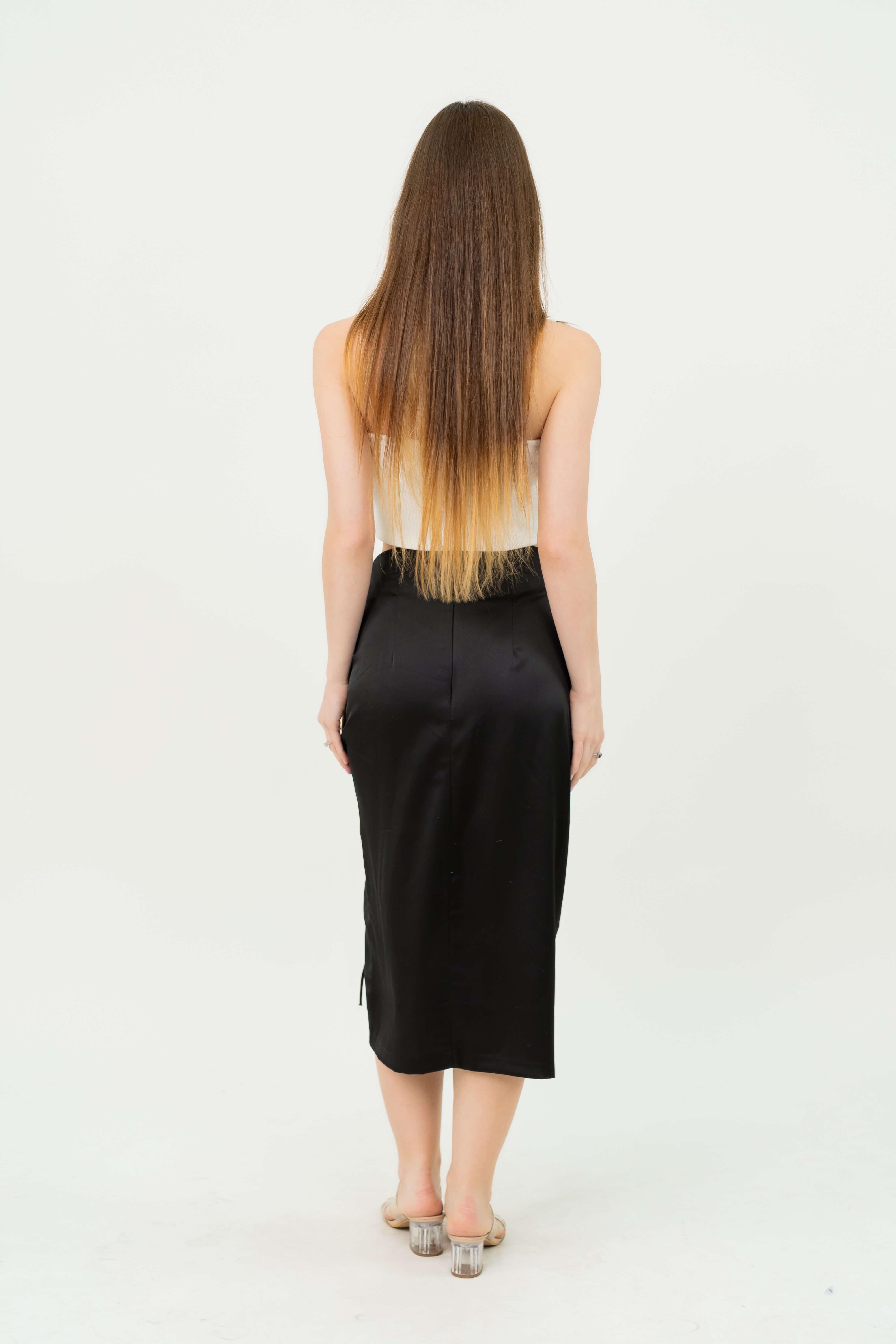 التصميم: تنورة سادة بقصّة مستقيمة، مزمومة من أحد الجوانب برباط ناعم، وفتحة جانبية تضيف أنوثة وأناقة للتصميم.