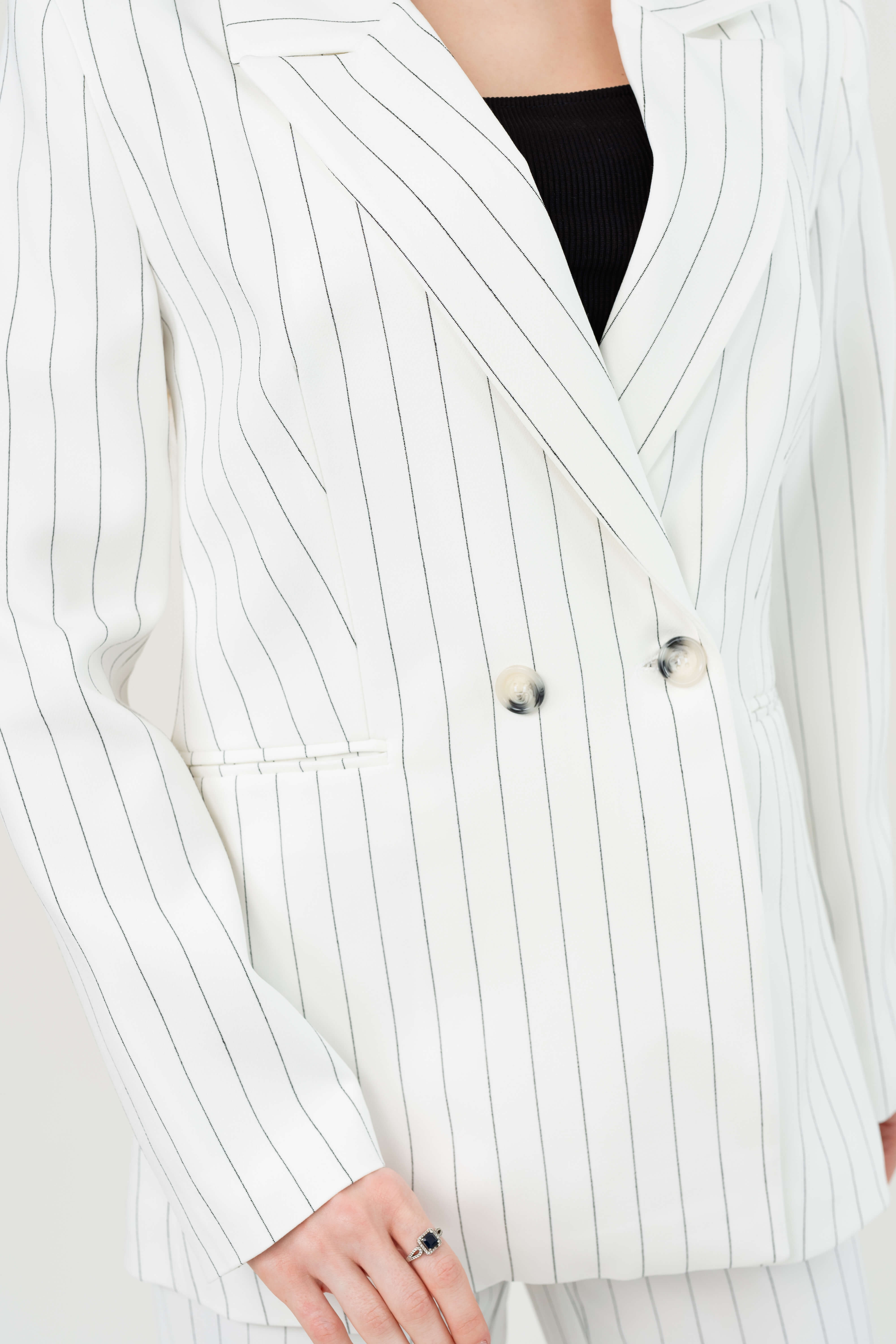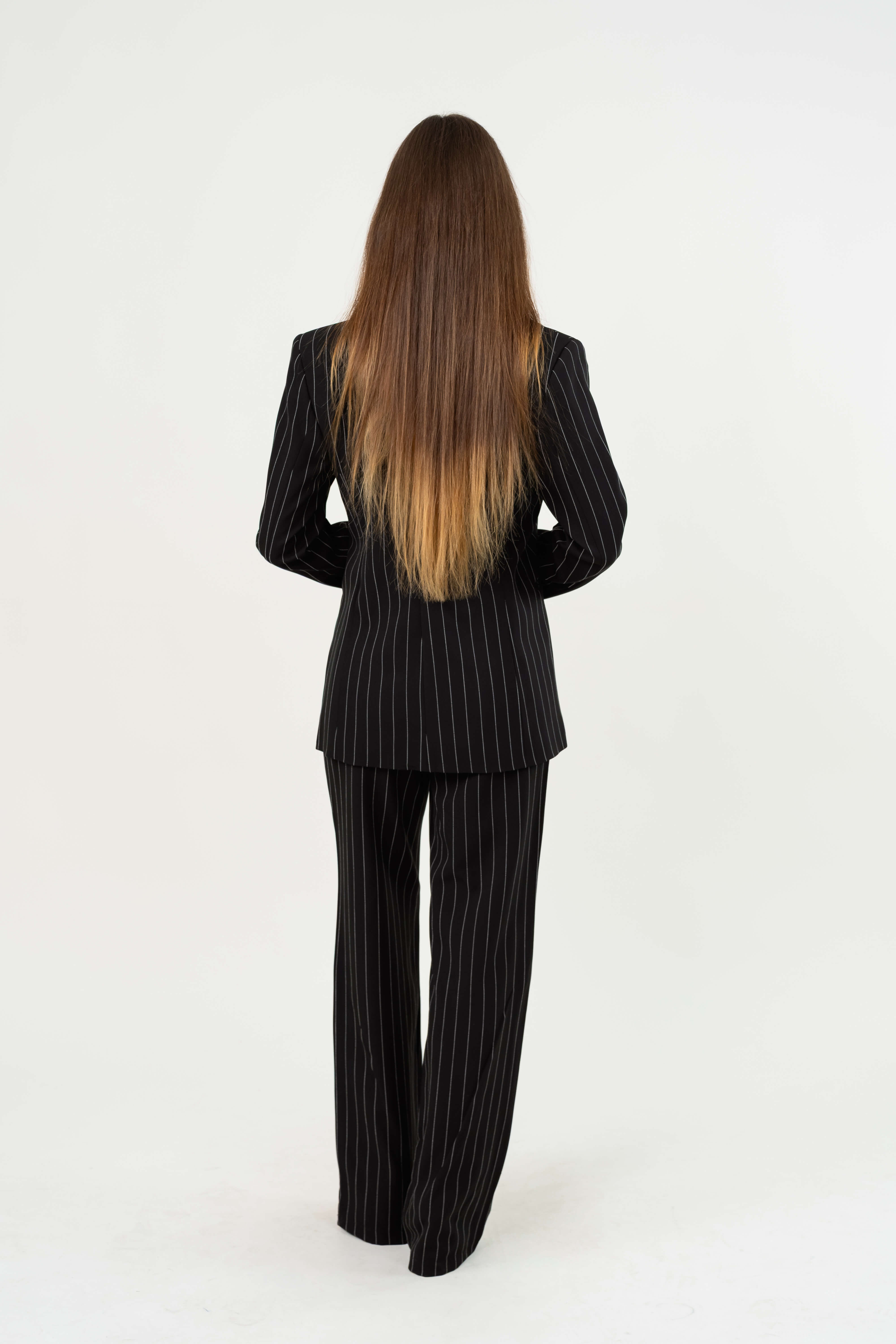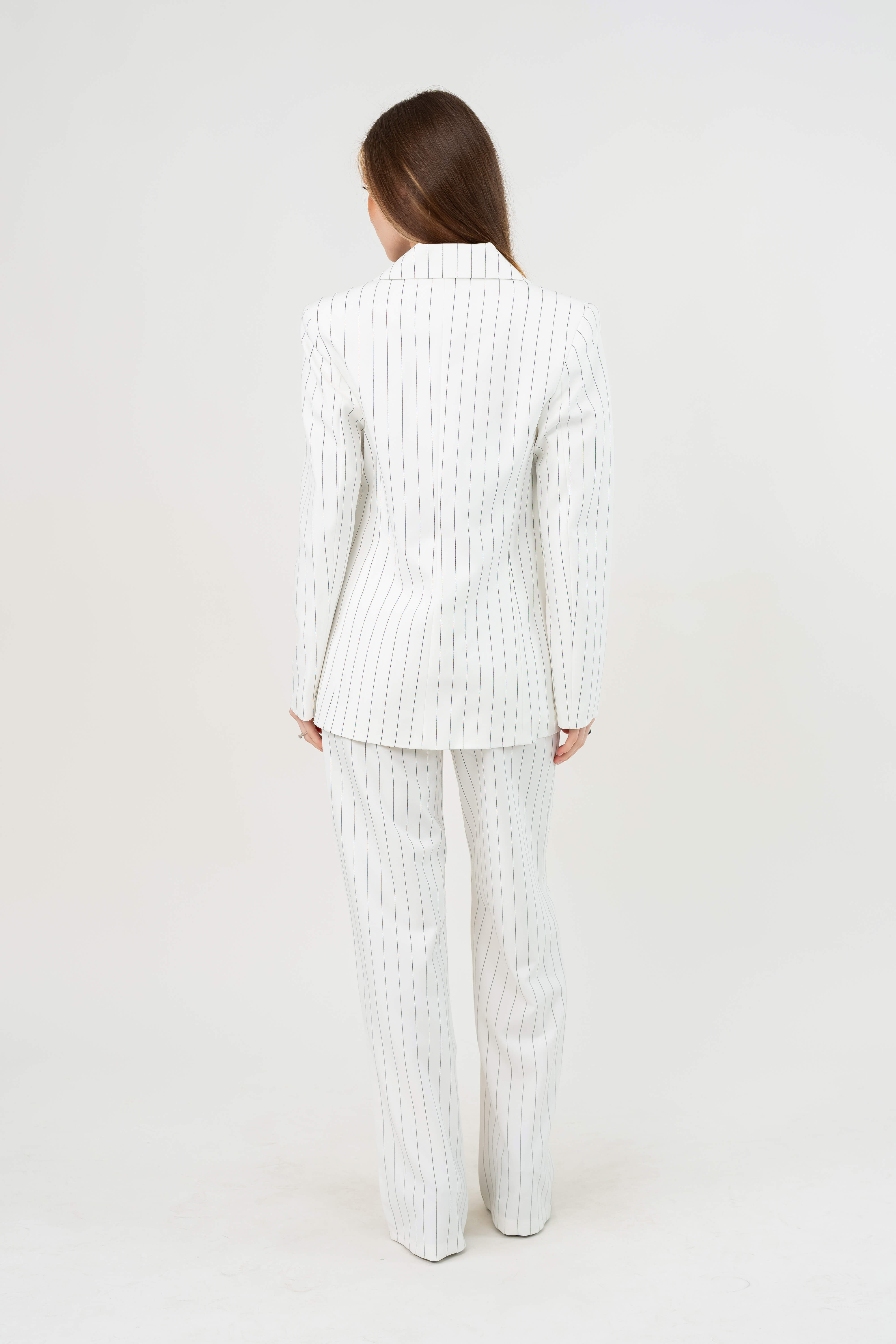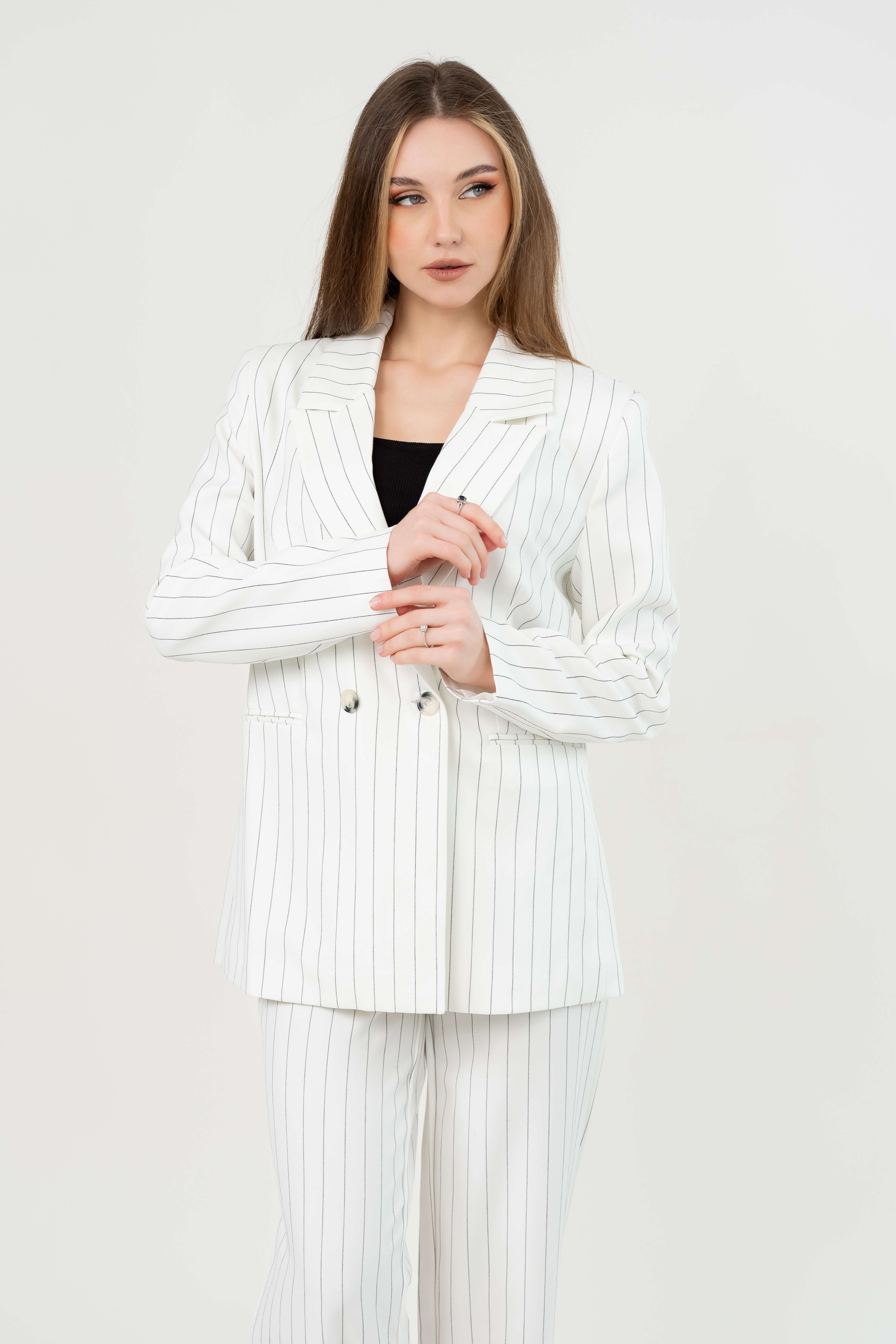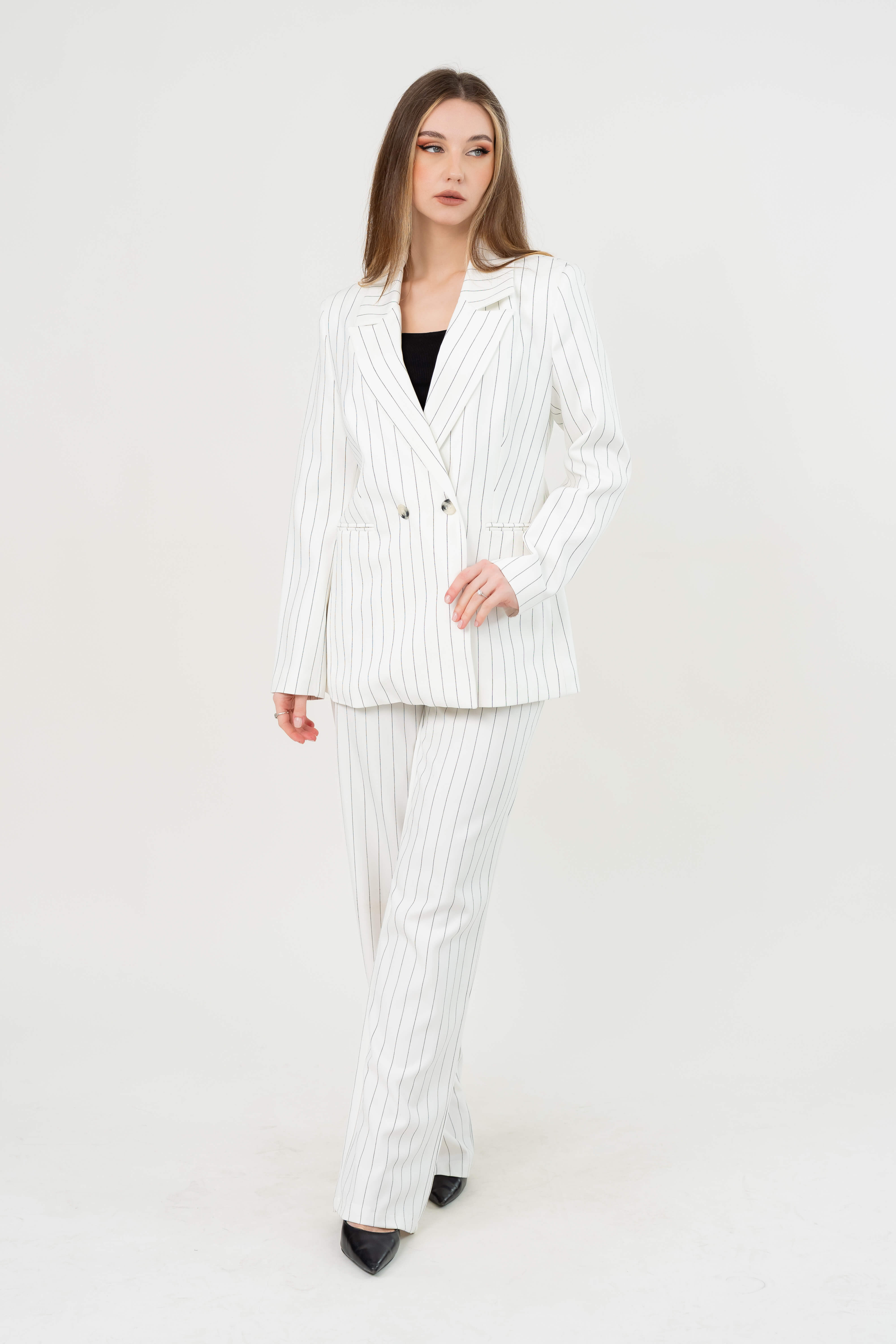 بدلة رسمية نسائية أنيقة بخطوط طولية يمنحك مظهرًا راقيًا وجذابًا، مثالي للمناسبات الرسمية أو الإطلالات العملية الأنيقة.